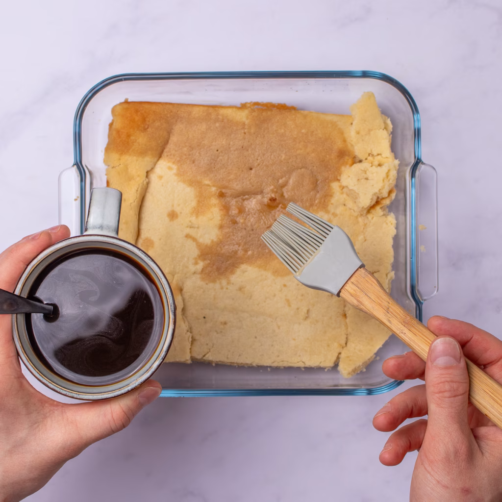 - Assemble Layer One – Coffee Soak: Brush or pour about half of the cooled coffee syrup evenly over the cake layer. I prefer brushing for more control. It seems like a lot of liquid, but the cake will soak it up, and you want that proper coffee hit.